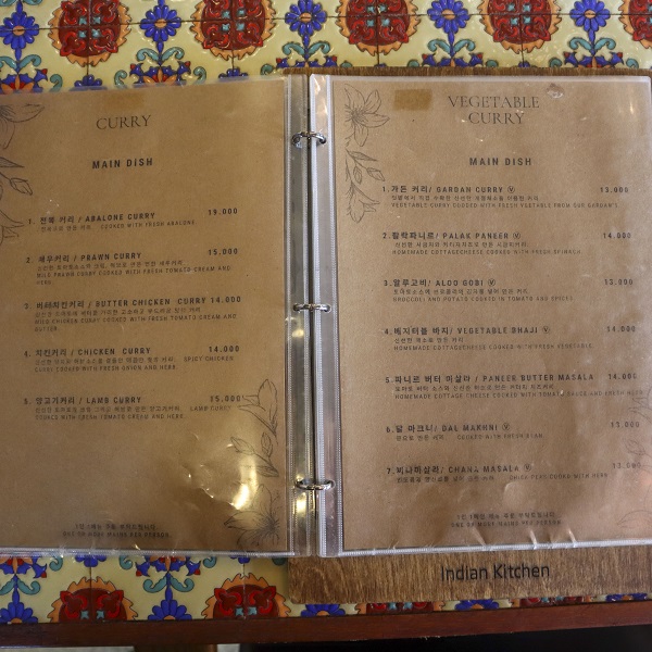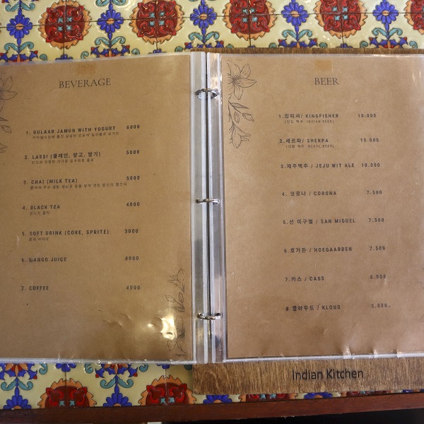 인디언키친의 메뉴판이에요!!